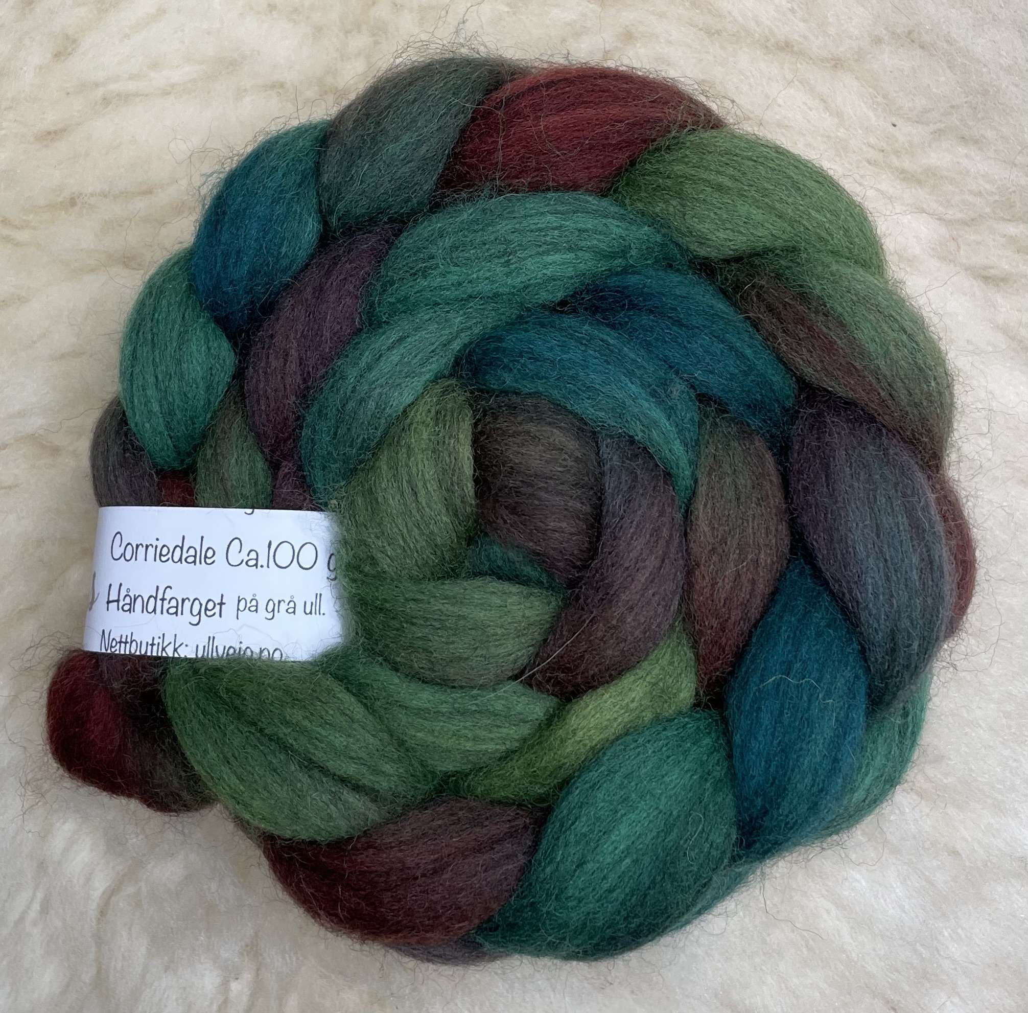 Håndfarget på Corriedale som er en lettspunnet og god nybegynnerfiber. Farget på grå ull som gir en dyp og melert farge. Ca 100 gr.