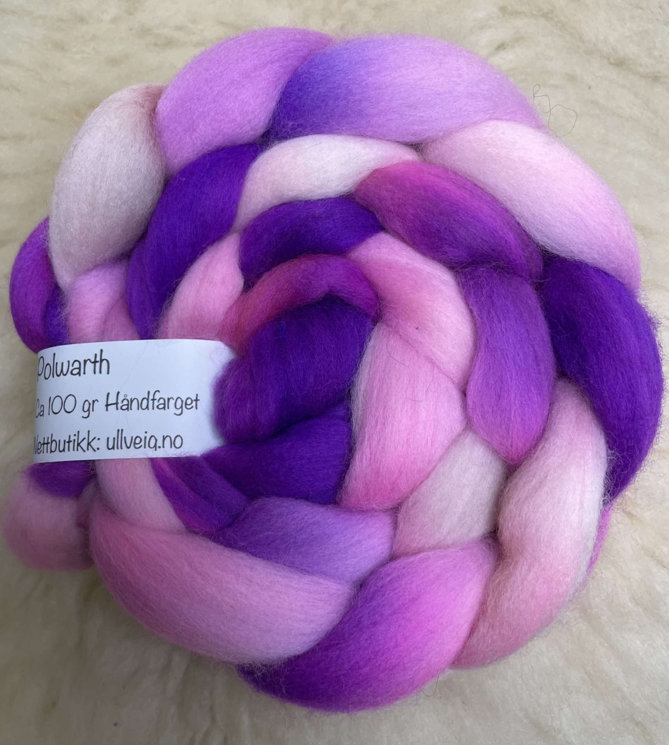 Håndfarget på ull Polwarthsau som har en myk og anvendelig fiber, også fin nybegynnerull, lettspunnet med god struktur. Ca 100 gr. Litt varmere farge i virkeligheten, ikke så blå.